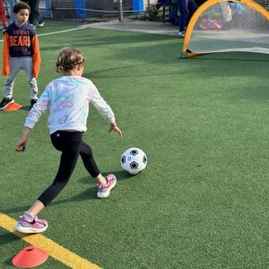 In our soccer introduction for kindergarten, students focus on the basics of the game. They practice overhead throw-ins, passing for accuracy, and the key steps of dribbling, passing, and scoring.