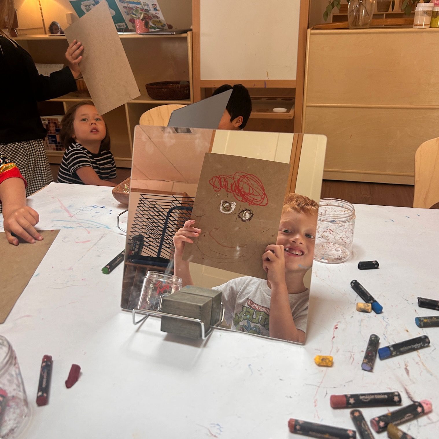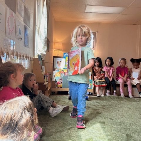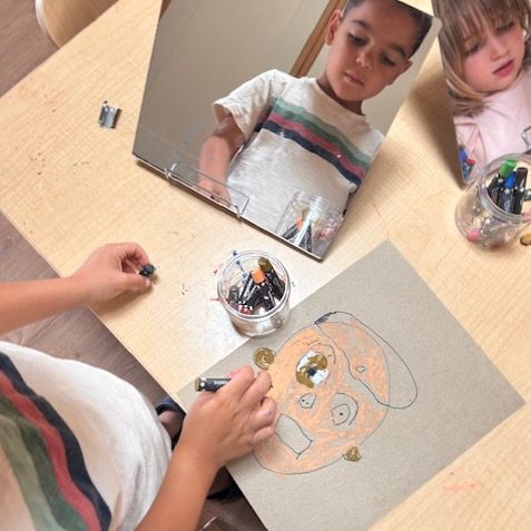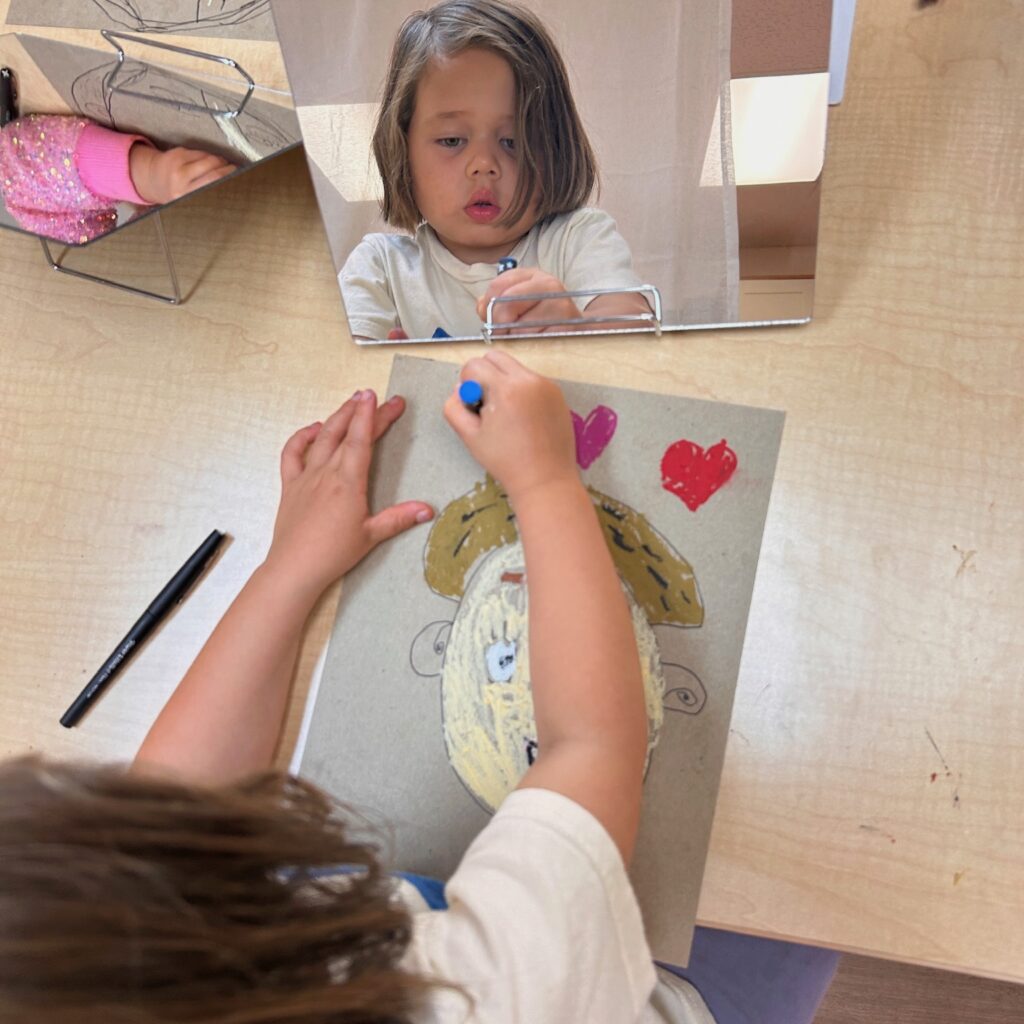 “Who am I?” “How am I similar to and different from others?” are questions that run through play and work time in TK. One of the ways children explore these concepts is through self portraits. Students consider skin color, hair color and style, and what they like about themselves. We look in the mirror to notice and draw details. Share time is when we make observations about each portrait and share questions and compliments for the artist.