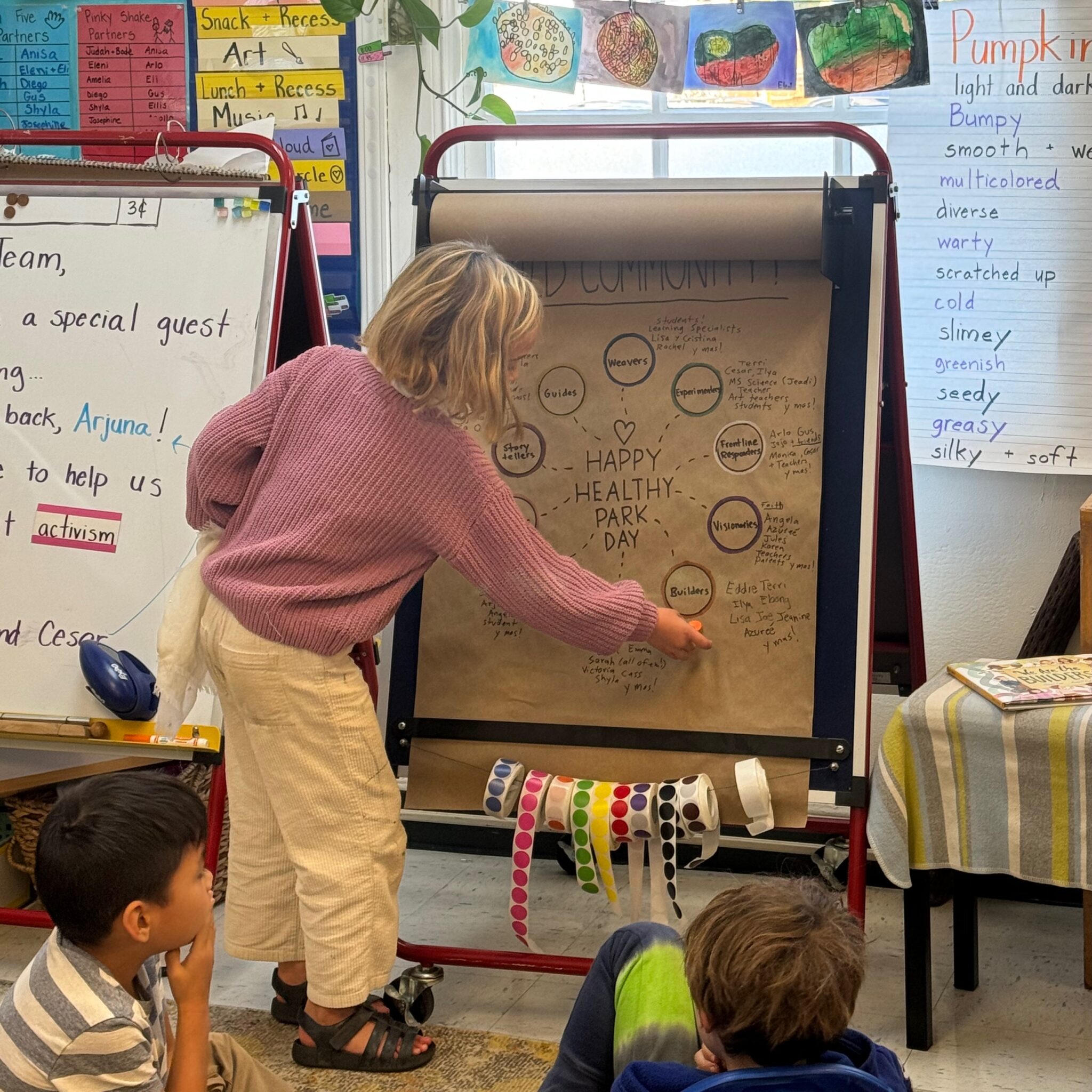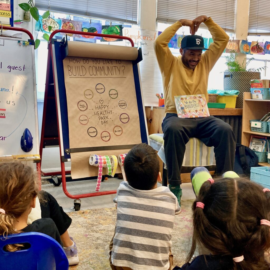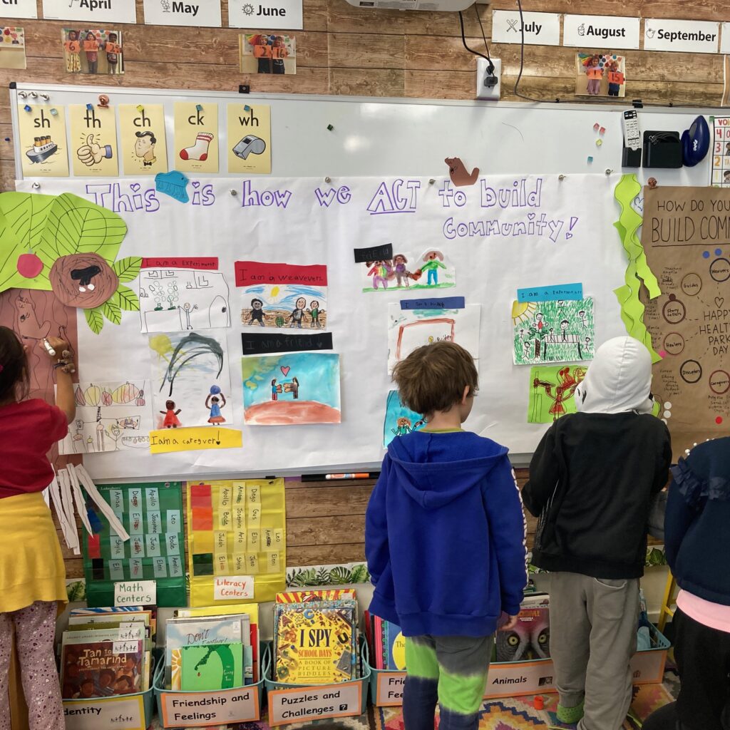 How do we each as individuals make positive change in our community? 1st graders explore this question through Deepa Iyer’s book We Are The Builders. Using Iyer’s Social Change Ecosystem, students discover that a thriving community needs many different kinds of builders—from healers and caregivers to visionaries, storytellers, and experimenters. Students brainstorm how members of our Park Day community embody these different roles, and bring this understanding to life through a vibrant mural celebrating their own roles in our community.