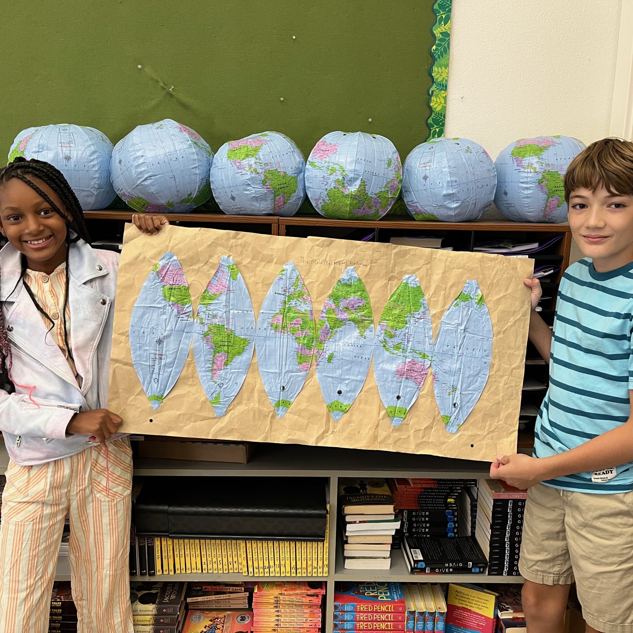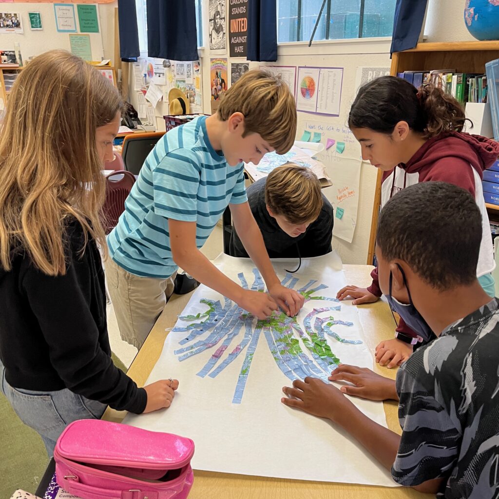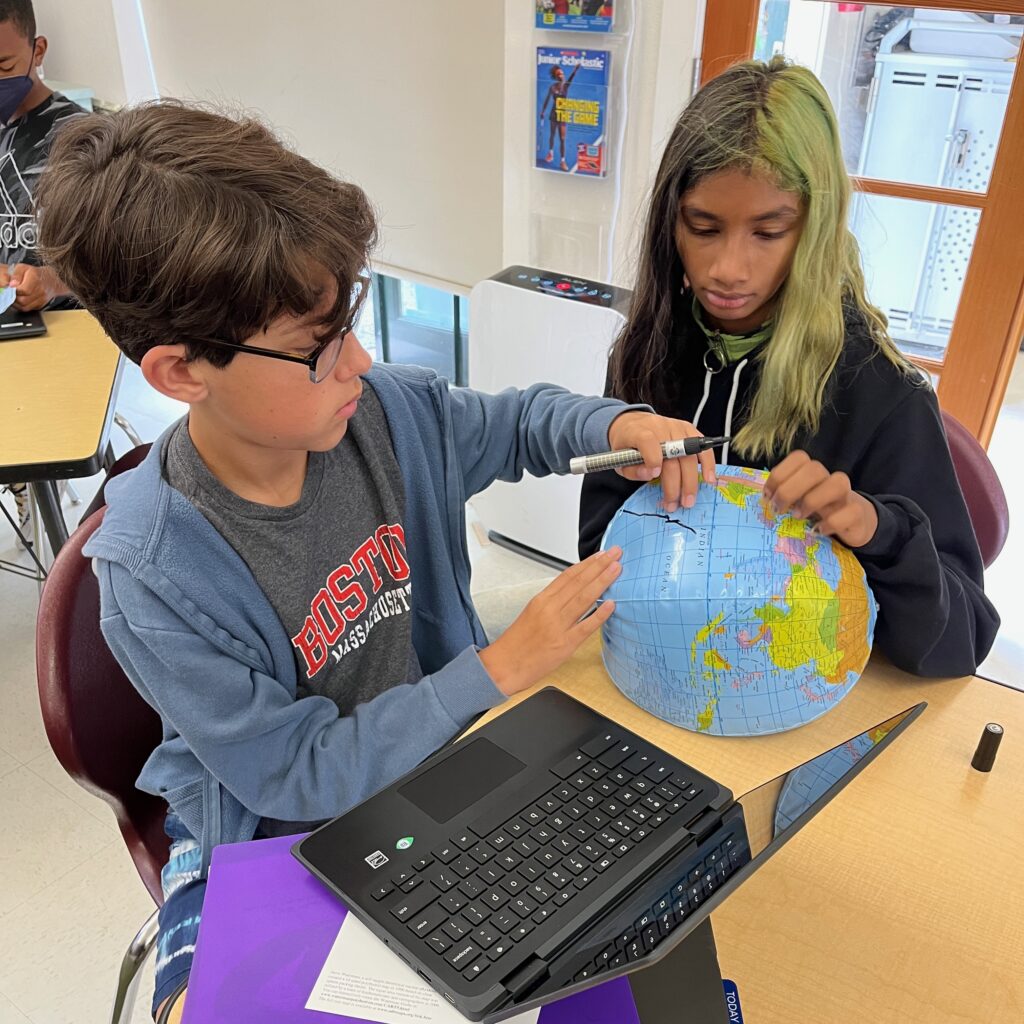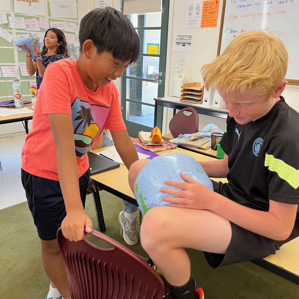 5th grade cartographers explore how maps both reveal and reshape our understanding of the world. Students examine the limits of projecting the globe onto a 2D surface. They discuss how mapmakers make choices that influence perspective and power, including distortions of size and shape. Students then create their own maps by dissecting a globe and deciding what is most important to preserve. Towards the end of the unit, students select a map to replace the traditional north-up projection in their Social Studies classroom.