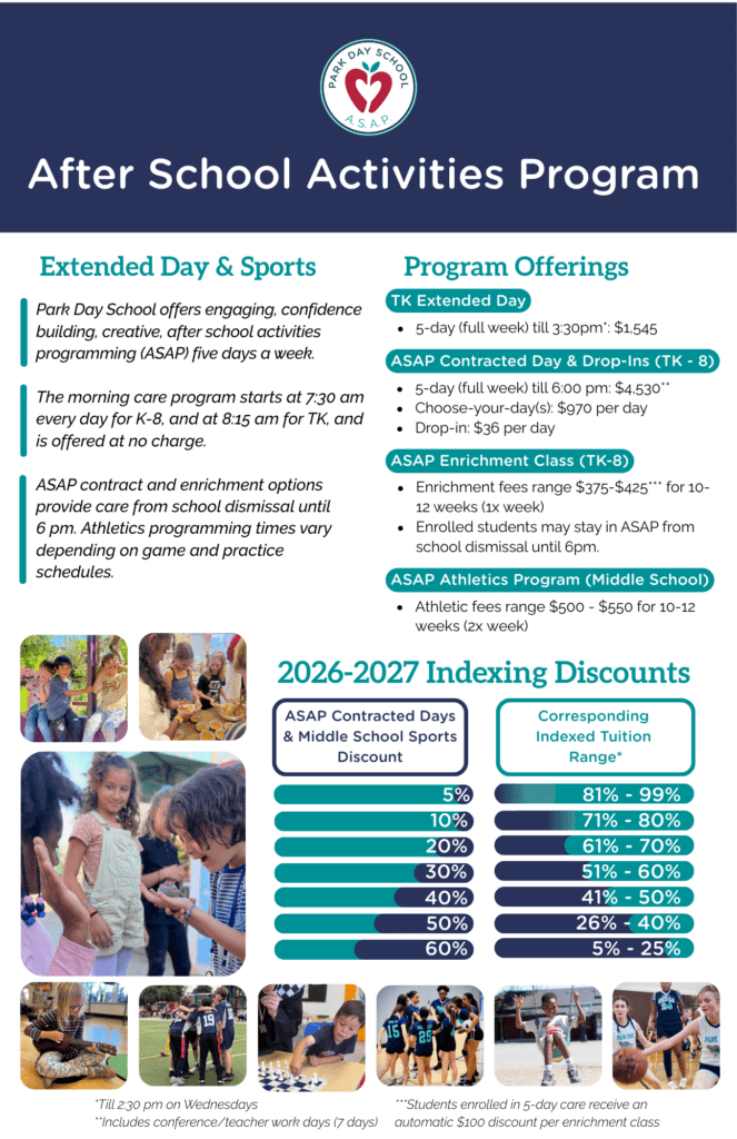 Park Day’s no-cost morning care program begins at 7:30am for students K-8 and 8:15am for TK students. The After School Activities Program (ASAP) offers a wide range of academic and co-curricular choices until 6pm daily. Students can engage in optional enrichment classes, language and music academies, or free and structured play.
